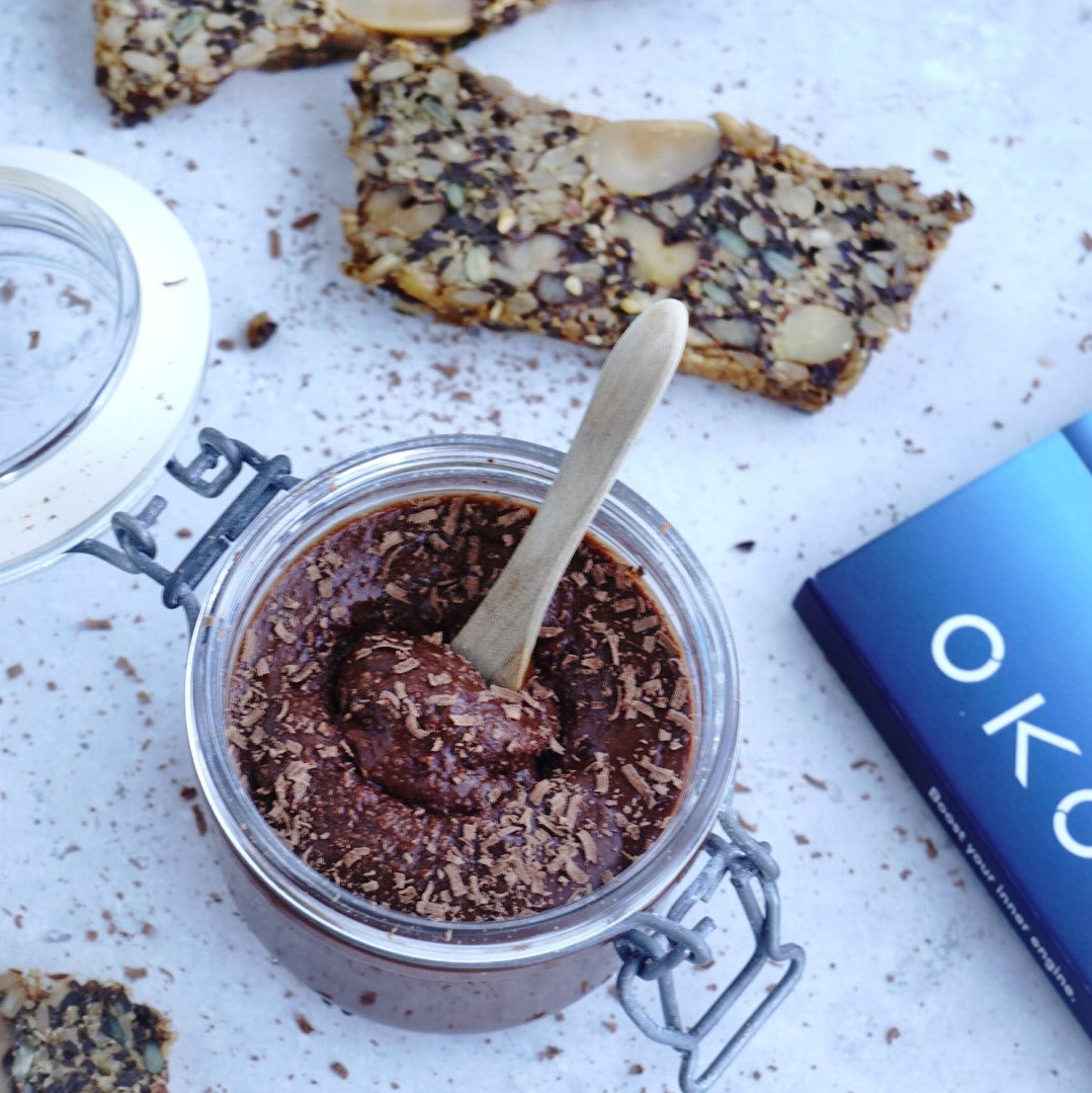 - Pendant ce temps, faire fondre une tablette OKONO avec 1tl d'huile de noix de coco et l'incorporer au beurre de noix.