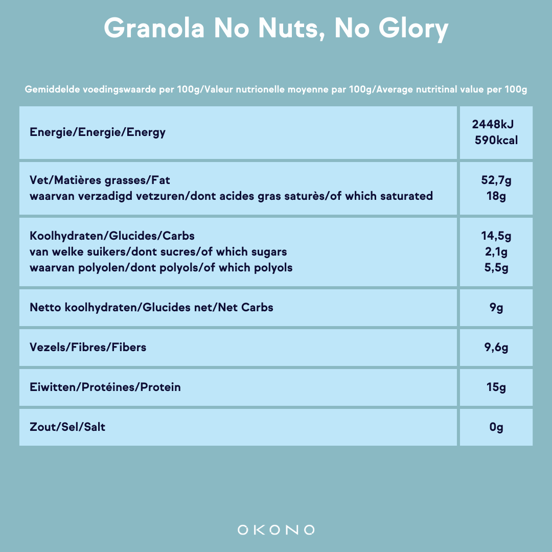 Notre granola No Nuts, No Glory (300g) est une combinaison harmonieuse de noix de pécan, de noix du Brésil, d'amandes, de graines, d'un soupçon de cannelle et de noix de coco croquante. Une portion quotidienne ne contient que 2,7g de glucides nets.