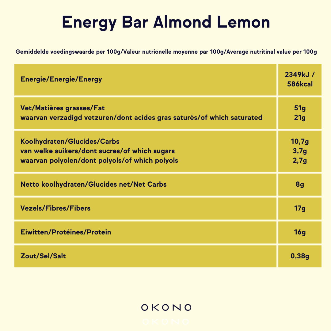 Onze Almond Lemon Energy Bar (40g) bevat slechts 3g netto koolhydraten en kan op elk moment van de dag gegeten worden, zoals bij het ontbijt, onderweg of voor/na het sporten. Het heeft geen invloed op je bloedsuikerspiegel.