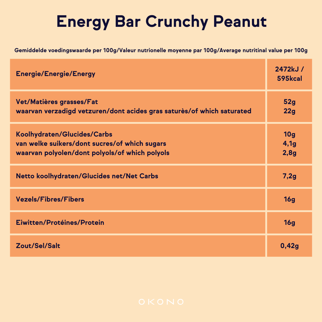 Onze Crunchy Peanut Energy Bar (40g)bevat slechts3g netto koolhydratenen kan op elk moment van de dag gegeten worden, bijvoorbeeld bij het ontbijt, onderweg of voor/na het sporten.
