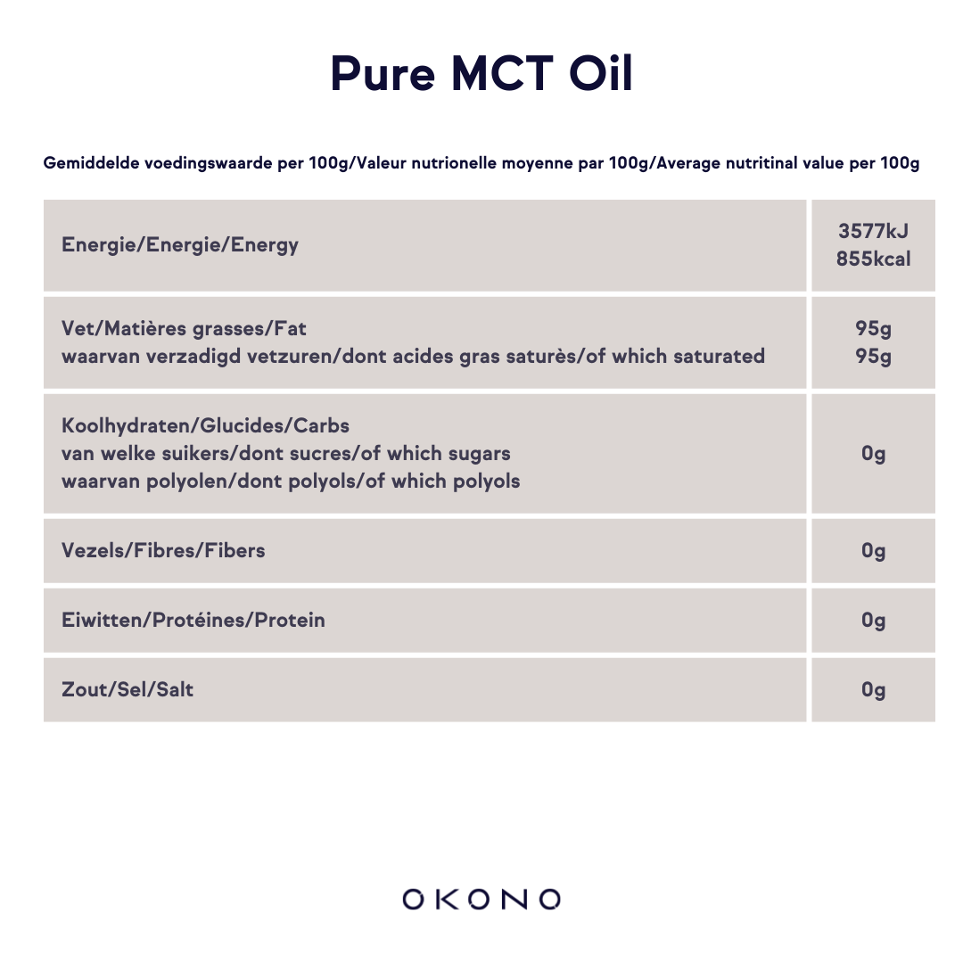 MCT's, oftewel middellangeketentriglyceriden, zijn een soort verzadigd vet. MCT's worden snel opgenomen en omgezet in energie door de lever, waardoor ze een snelle brandstofbron vormen voor lichaam en hersenen. Ze kunnen helpen bij gewichtsbeheersing, ketose ondersteunen en de cognitieve functie verbeteren. MCT-olie bevat 100% MCT's, waardoor het een geconcentreerde bron is. Kokosolie wordt gemaakt van het vruchtvlees van kokosnoten en bevat 54% MCT's.